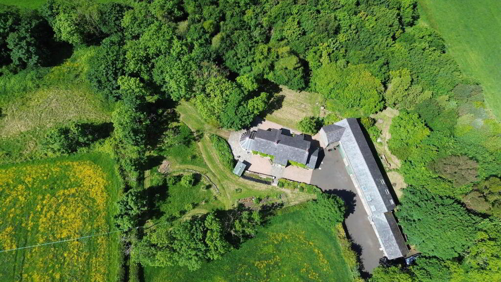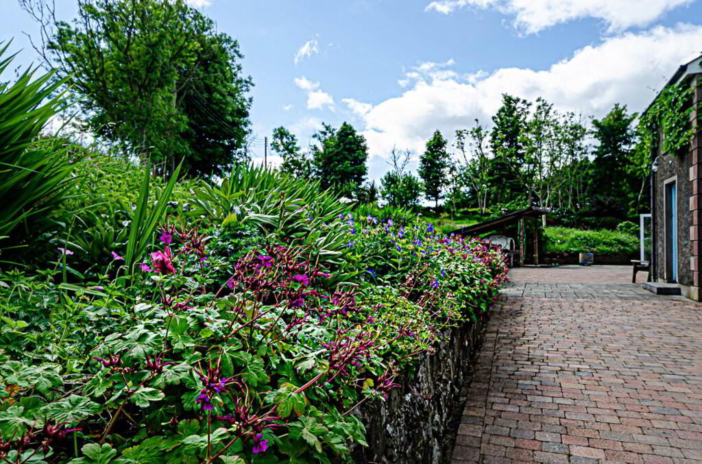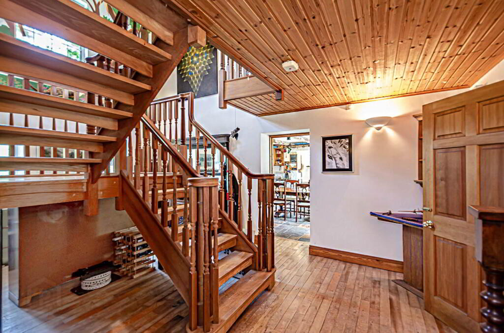 Outside there are well-finished patio areas, a terraced grass area, and extensive tree planting over several acres. The property is accessed via a long concrete laneway and SMA surfaced yard. Along one side of this yard, are restored outbuildings which have been converted into four garages (which could accommodate 14 cars), a bright, spacious centrally heated and insulated workshop, and several large storage areas. A set of concrete steps leads up to one of these storage areas. This was remodelled for use as a flat or holiday let, but the work was never completed.