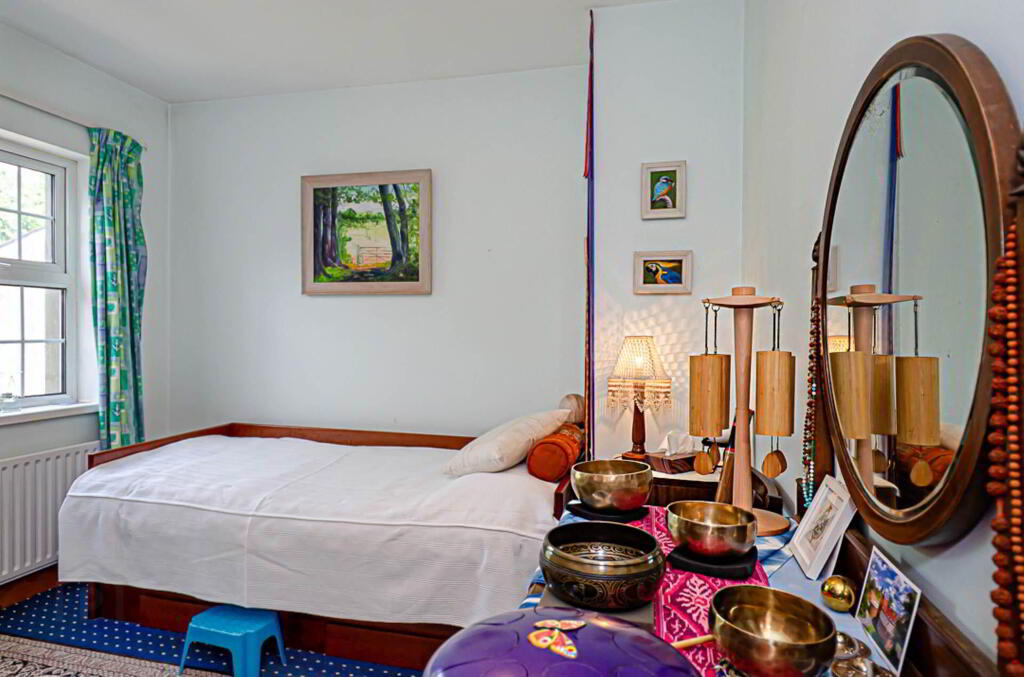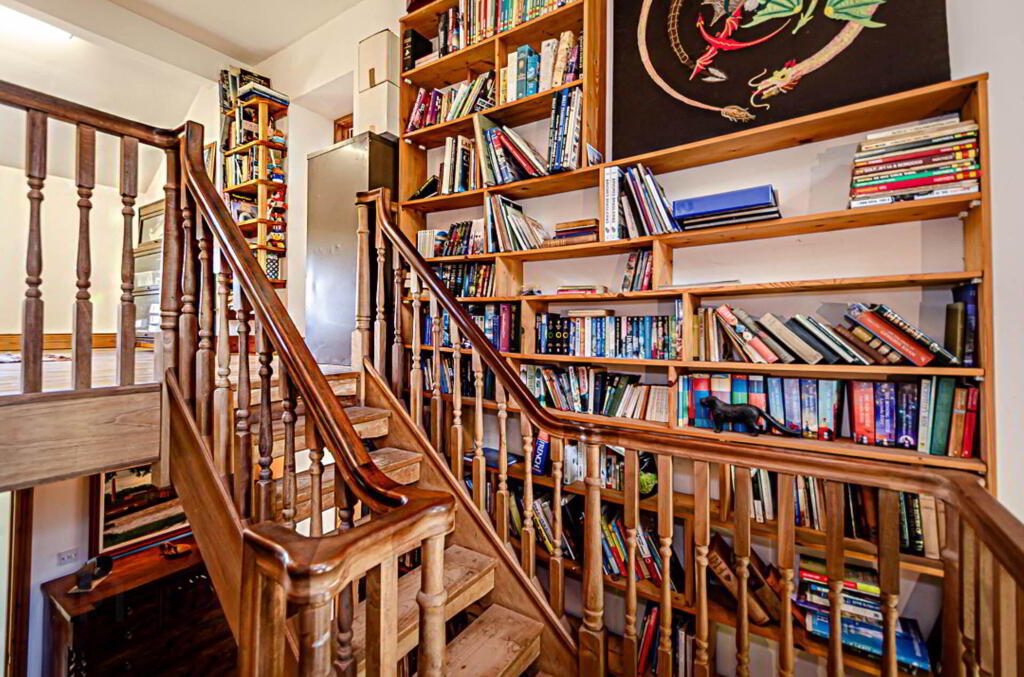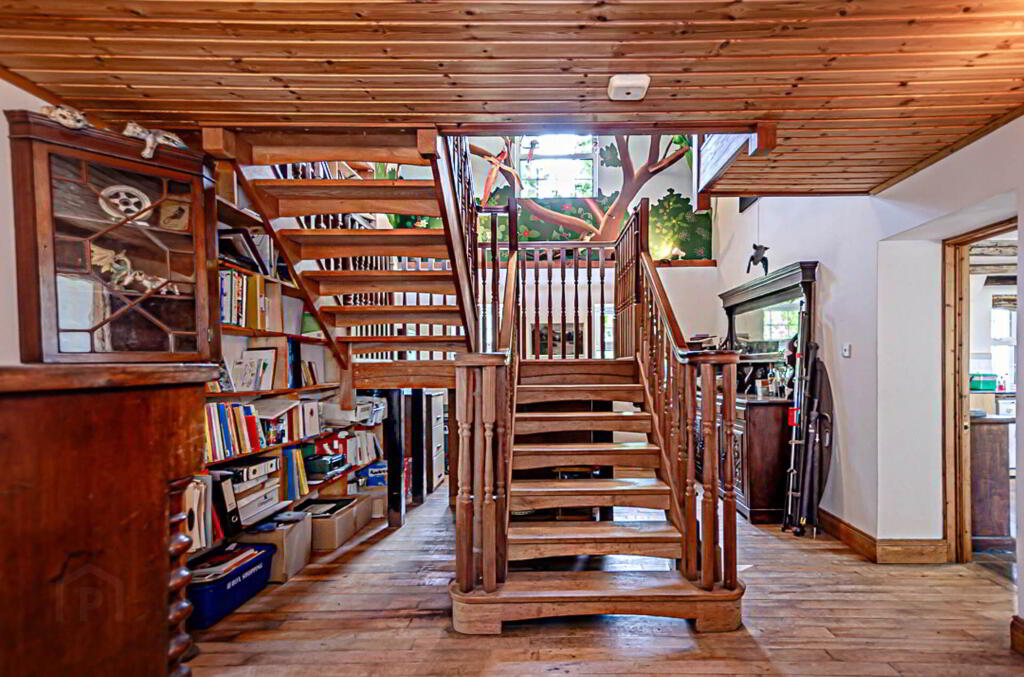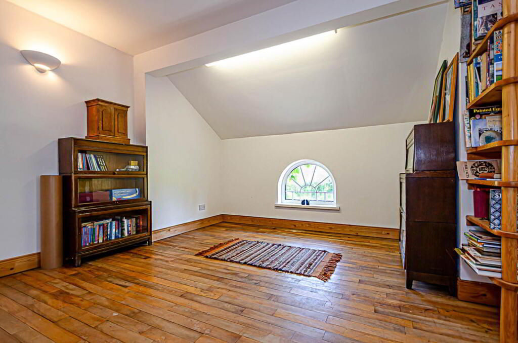 The double-height hallway has an open staircase to a bright, airy mezzanine, useful for extra living, study or bedroom space. Also included here is a floor to ceiling bookcase accessible from the stairs. The upper wall features a mural inspired by the current owner`s years in Brazil. To one side there is an enormous main bedroom which could easily be divided into smaller bedrooms. It has an en suite bathroom and small wood burning stove. To the other side of the mezzanine are two more bedrooms and a bathroom. Mezzanine and main bedroom are also floored with the reclaimed maple.