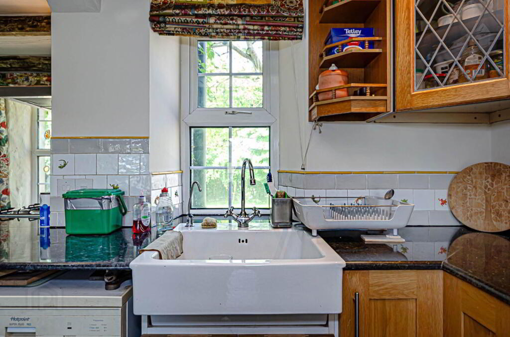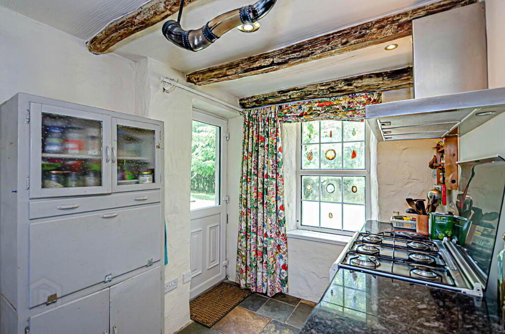 Utility room - 17'0" (5.18m) x 7'10" (2.39m) Range of high and low level units and boot space with laminate worktop. Belfast sink with tiled splash back and granite work top beside, and plumbing for washing machine beneath. Exposed original cottage walls, Chinese slate floor with matwell, and traditional ceiling mounted clothes drying rack/ laundry pulley. Oil fired central heating boiler and strip lights. Hardwood back door and stone steps