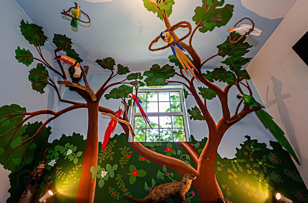 Entrance hall - 18'3" (5.56m) x 12'2" (3.71m) Double height hallway with mezzanine above. Maple wood floor (reclaimed from an old English mill), open timber staircase with mahogany spindles, 18ft high built-in bookcase, timber ceiling and uplighters. Hand-painted mural inspired by Brazil