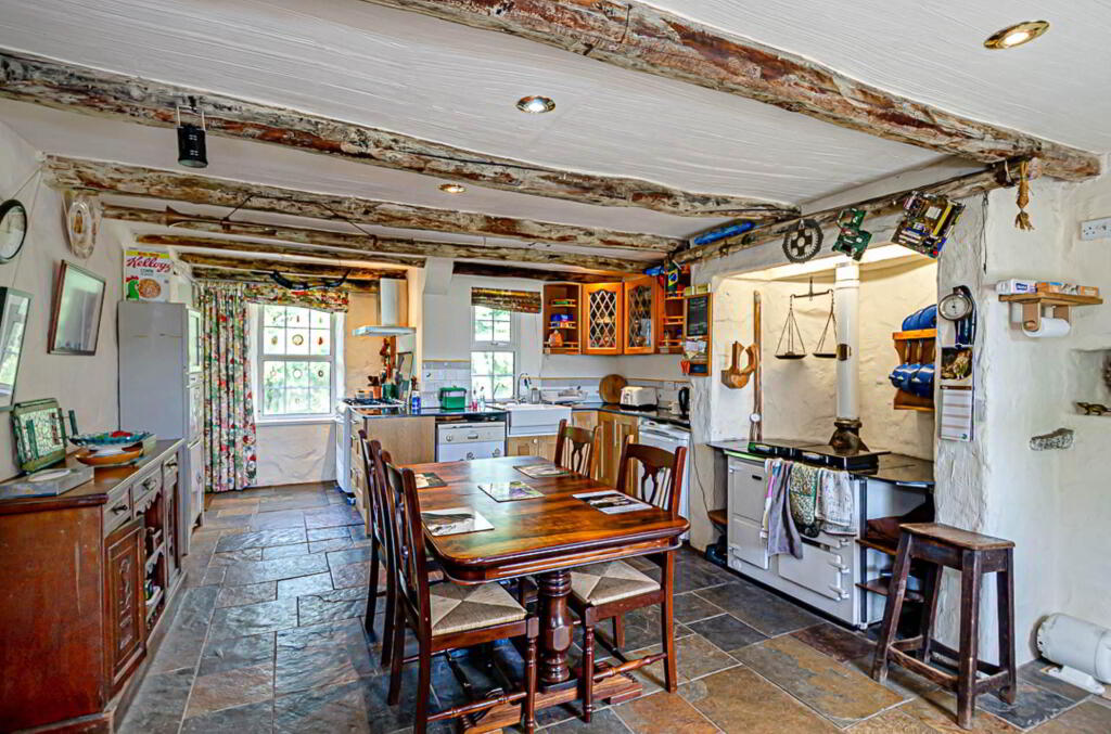 Family kitchen - 23'9" (7.24m) Max x 14'3" (4.34m) Range of high and low level Oak units with Indian granite worktops and glazed display cupboards. Oil fired ESSE range with double oven, 2 hot plates and bespoke surrounding granite worktop with shelving below. Additional space for a gas and electric range cooker with stainless steel extractor fan above. Belfast-type sink and plumbing for dishwasher. Exposed original cottage walls and original beams, Chinese slate floor, part tiled walls and recessed spotlights. Space for table and chairs and large desk. U.P.V.C. back door to paving at rear
