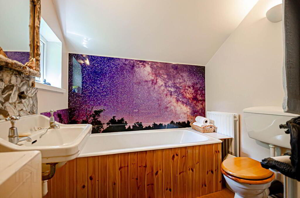 Bathroom - 10'6" (3.2m) Max x 7'5" (2.26m) Max Timber panelled bath with decorative splash back, W.C. and wash hand basin with splash back and shaving light above. Hot press with reclaimed door