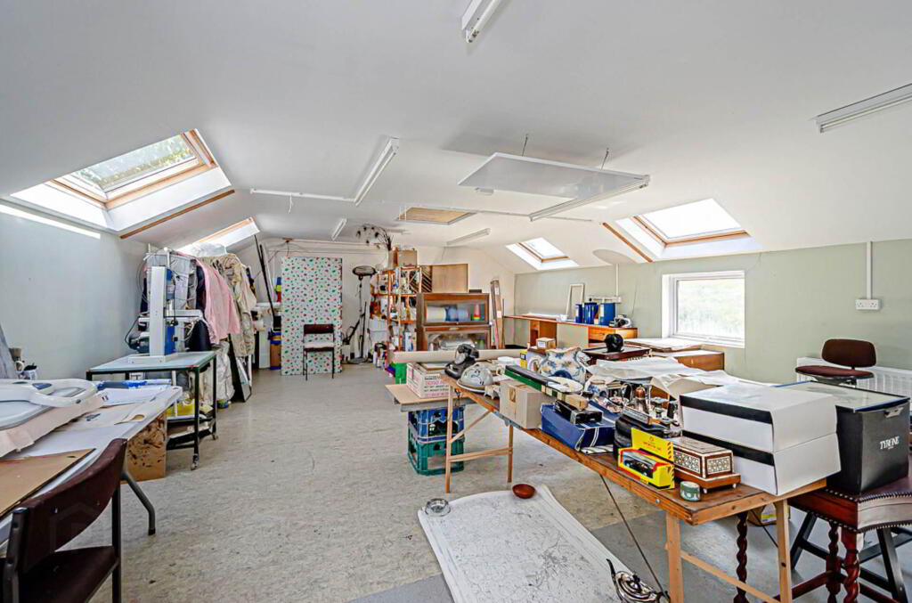 Workshop - 30'6" (9.3m) x 20'8" (6.3m) Large centrally heated upstairs workshop with insulated waterproof floor, strip lighting and electric sockets on ceiling and walls, sink area, 6 velux windows. Doorway to space above car ramp on left hand side and doorway to internal staircase case leading to exit via single storey section of building to right hand side