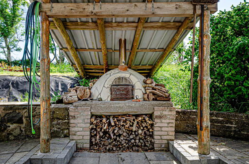 Outside Paving to front, side and rear in Tobermore natural stone-effect mixed sized slabs and brick paving. Sheltered patio area with fabulous hand-built, insulated pizza oven with metal door from Brazil. Raised beds and lawn areas with shrubs and trees including a wide variety of Hellebores and some native Brazilian trees