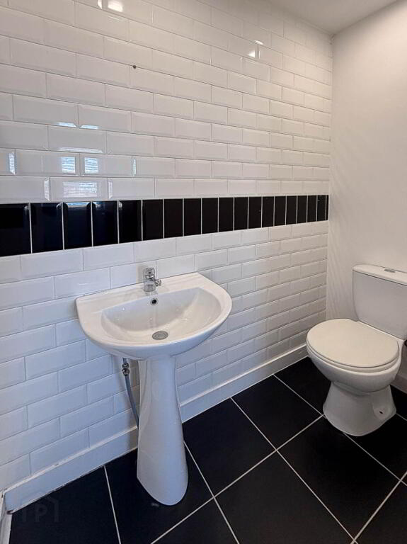 At the heart of the property is a sleek, modern kitchen with ample dining space, perfect for both everyday living and entertaining. French doors open directly onto the rear garden, seamlessly blending indoor and outdoor living. A convenient utility area and downstairs W.C. complete the ground floor.