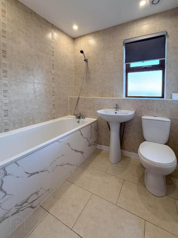 Bathroom - 6'5" (1.96m) x 6'0" (1.83m) White suite with shower attachment to bath taps, wash hand basin, W.C., modern tiled walls, ceramic tiled floor, recessed spotlights and extractor fan