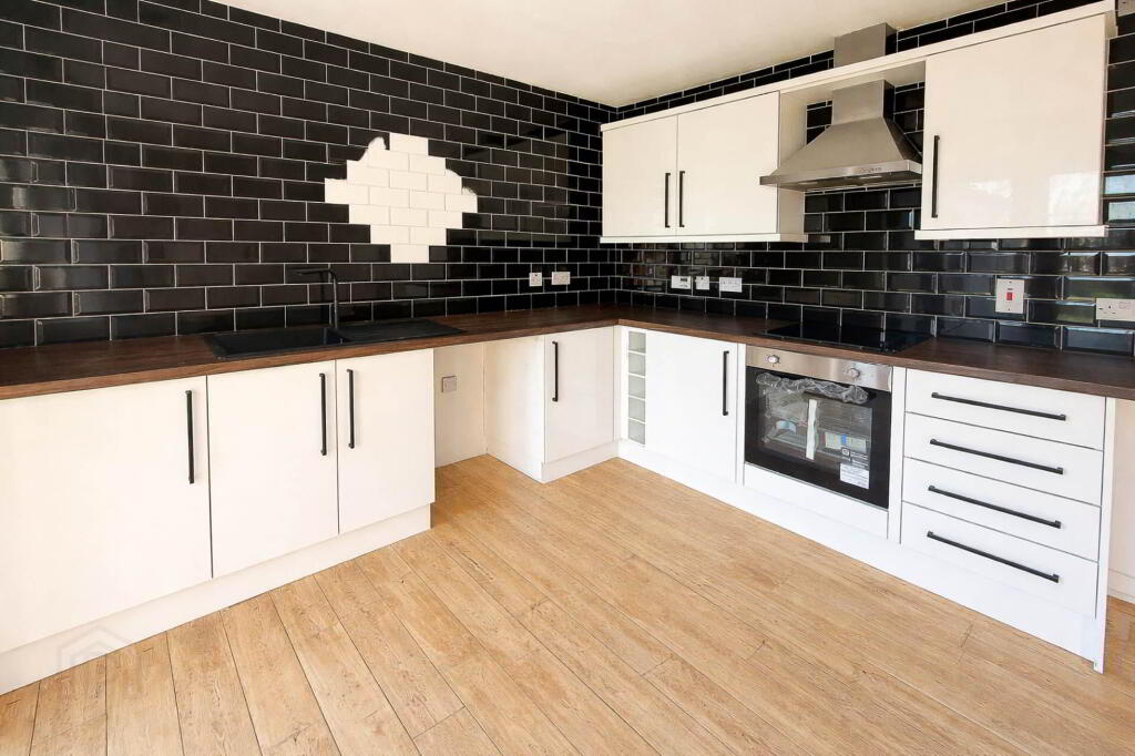 Kitchen with dining area - 18'3" (5.56m) x 10'6" (3.2m) Modern range of high and low level fitted units, stainless steel oven, ceramic hob, stainless steel extractor canopy, black sink and tap, part tiled walls, timber floor, plumbing for dishwasher and space for dining