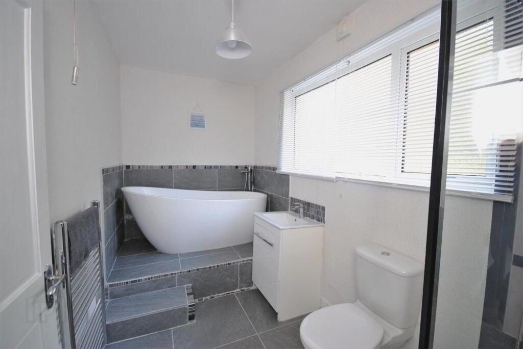 3.86m x 1.83m (12' 8" x 6' 0") Modern bathroom with contemporary suite, bath with free-standing taps, shower cubicle, wash-hand basin in vanity unit and W.C, tiled floor and part tiled walls, chrome towel rail radiator