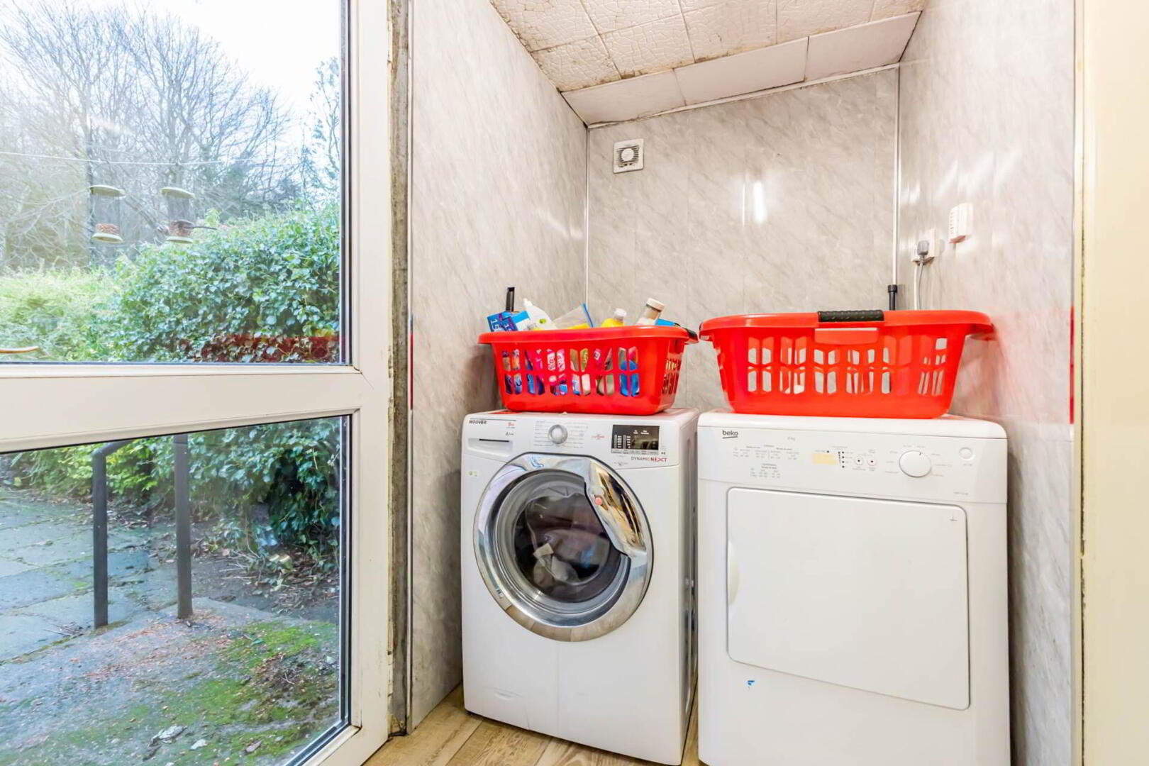 Plumbing for washing machine and space for tumble dryer, ceramic tiled floor and P.V.C. panelled walls