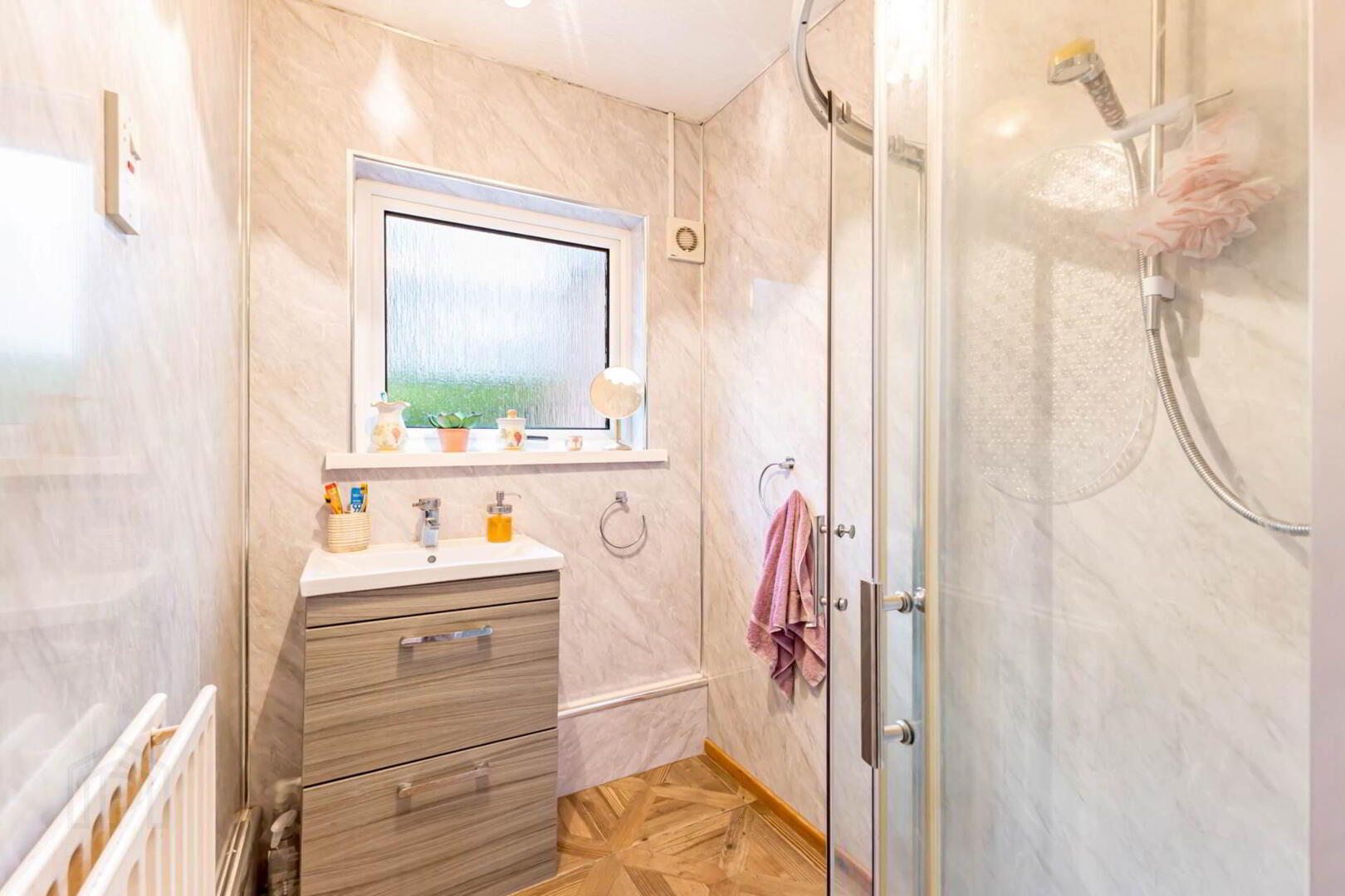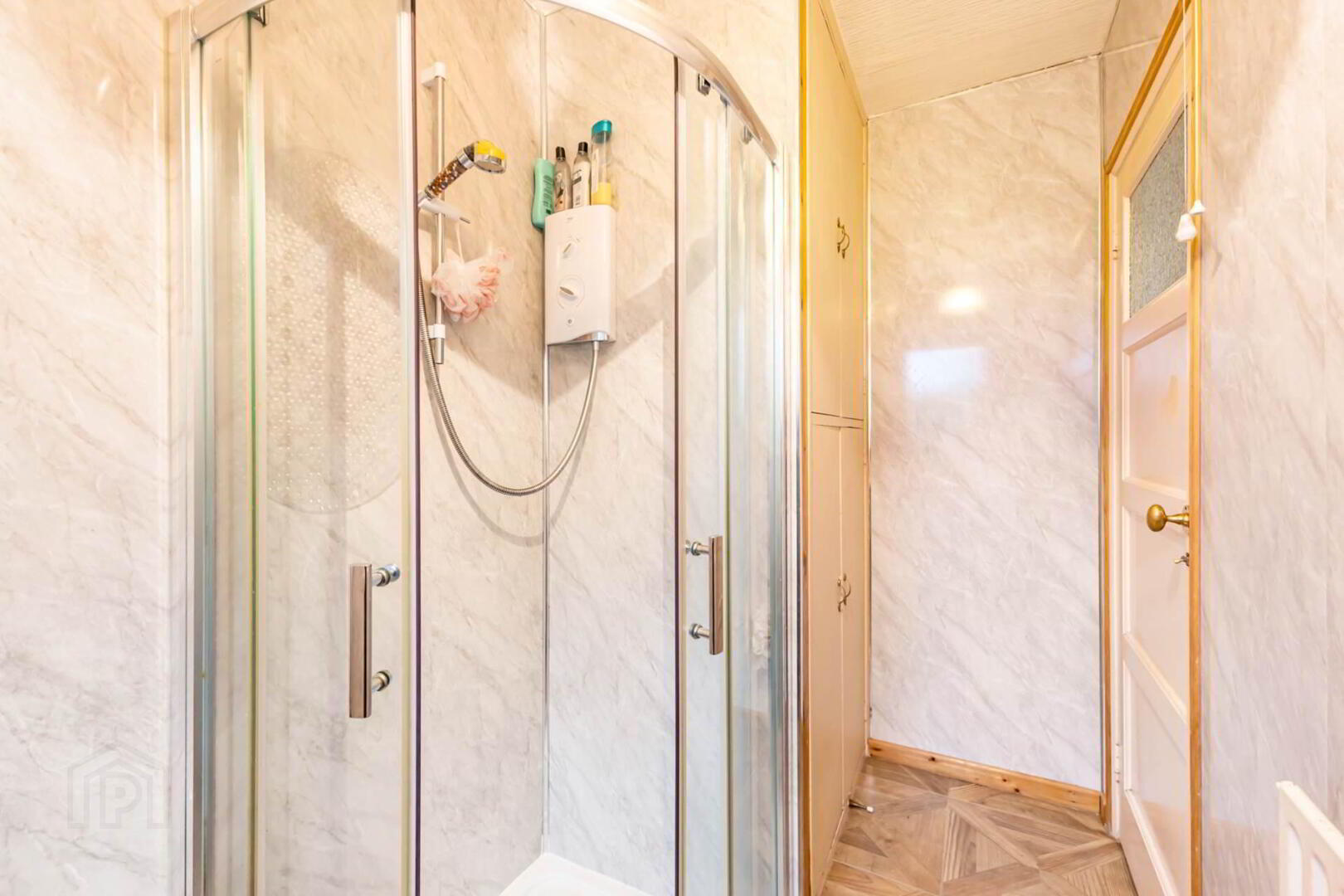 Corner shower cubicle with electric shower and sliding door, wash-hand basin in timber effect vanity unit, P.V.C. panelled walls, statement timber laminate floor and hot press